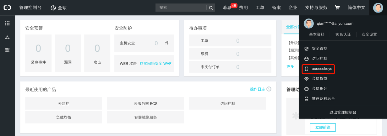 使用主账号登录阿里云控制台,单击页面右上角个人信息,展开下拉菜单,单击 “Accesskeys” 菜单项进入安全信息管理页面。