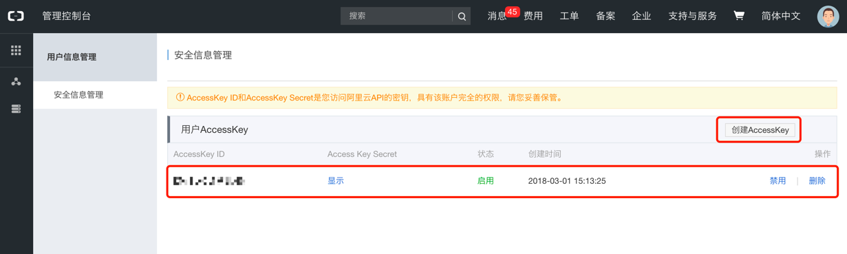 在安全信息管理页面,可以查看已存在的AccessKey信息,也可以单击 “创建AccessKey” 按钮新建用户AccessKey,新建AccessKey时阿里云会向账号联系人手机发送验证码,验证通过后才可以创建AccessKey。