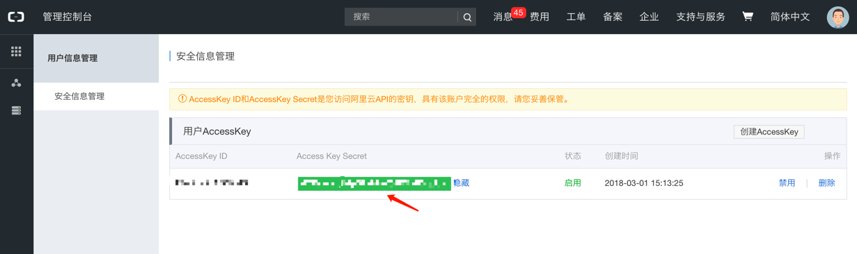 Access Key Secret默认不显示,单击"显示 “链接,阿里云将向账号所属的联系人手机发送一个验证码,验证通过后,才会显示Access Key Secret。
