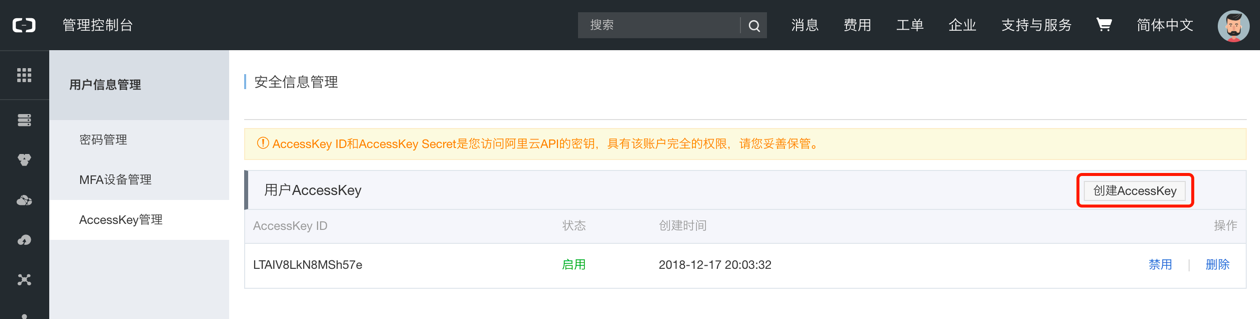 在安全信息管理页面,单击 “创建AccessKey” 按钮,创建AccessKey。
