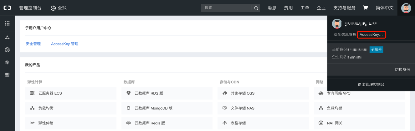 使用子账号登录阿里云控制台,单击页面右上角个人信息,展开下拉菜单,单击 “accesskey…” 进入安全信息管理页面。