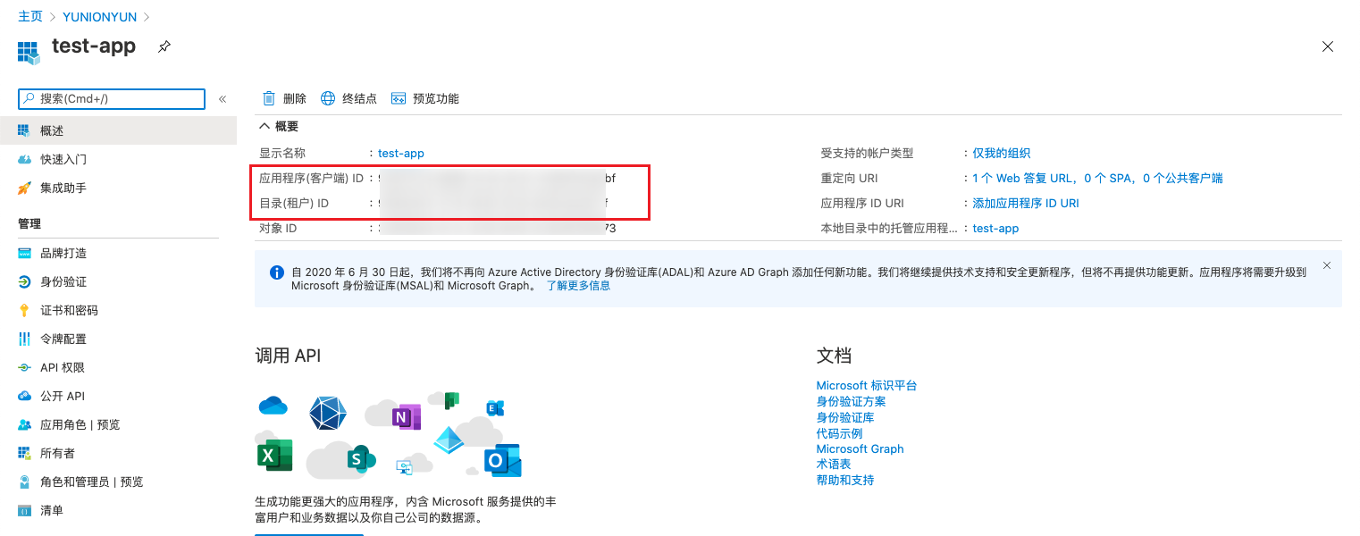 创建成功后,系统自动显示刚创建的应用程序详情页面。该页面的应用程序(客户端)ID即为所需的客户端ID、目录(租户)ID即为所需的租户ID。