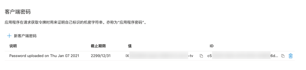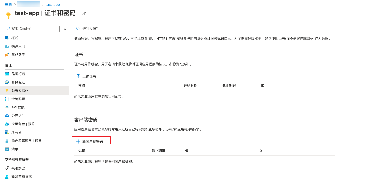 在应用程序详情页面单击 “证书和密码” 菜单项。进入证书和密码页面。单击 “新客户端密码” 按钮。