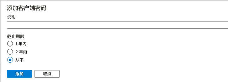 在弹出的添加客户端对话框输入密码说明、截止日期为“从不”,单击 “添加” 按钮新建客户端密码。