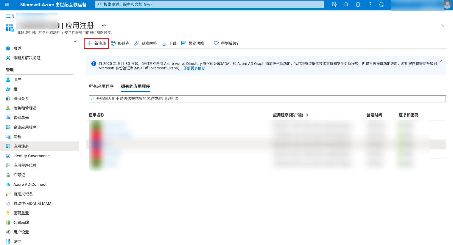 登录Azure控制台,单击左侧导航栏 “Azure Active Directory/应用注册” 菜单项,进入应用注册页面。建议新建一个专门的应用程序供云管平台调用Azure API。