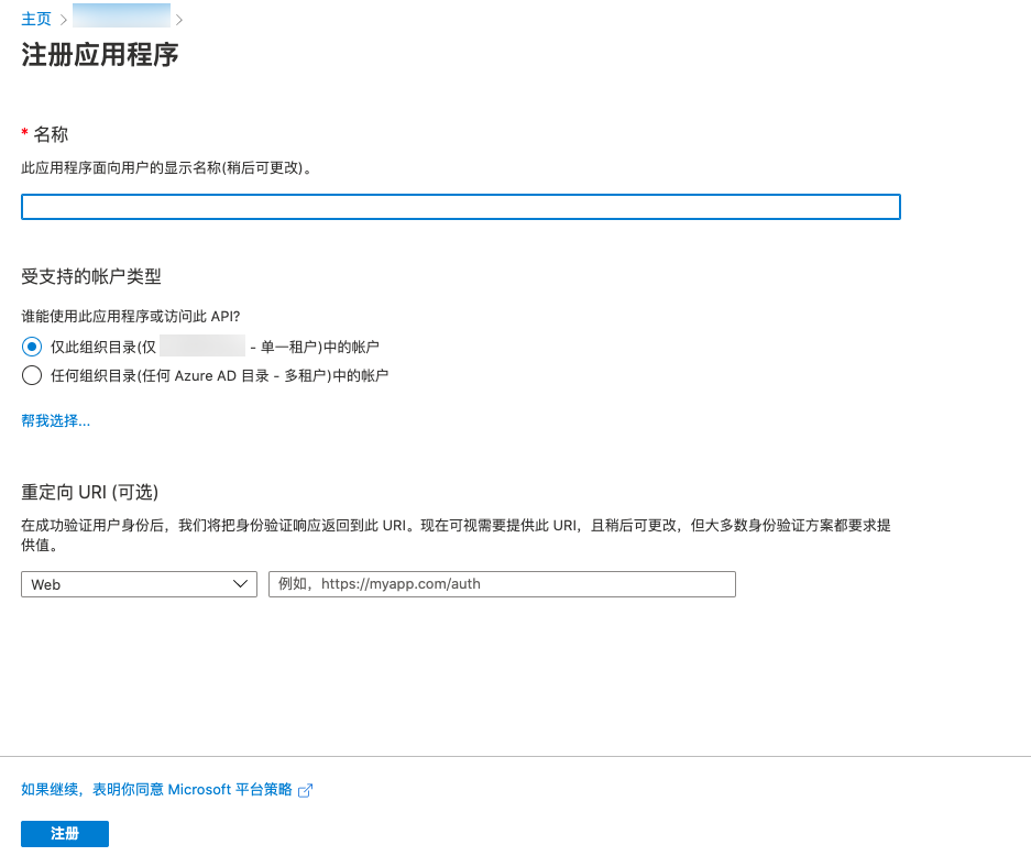 单击 新注册 按钮,在进入的注册应用程序页面,设置名称为任意值、设置受支持的账户类型为“仅此目录中的账户”,重定向URI设置为web,并输入以"https://“或”http://localhost“开头的URL地址,单击 “注册” 按钮。