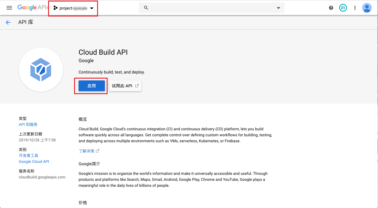在API库的Cloud Build API页面中启用授权项目的Cloud Build API。可通过顶部切换授权项目。