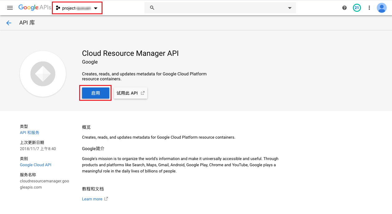 在API库的Cloud Resource Manager API页面中启用授权项目的Cloud Resource Manager API。可通过顶部切换授权项目。