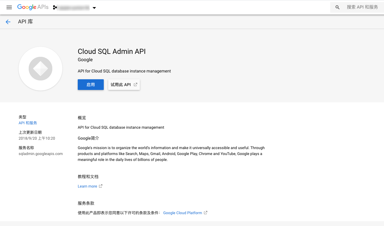 - 在API库的Cloud SQL Admin API页面中启用Cloud SQL Admin API。可通过顶部切换授权项目。