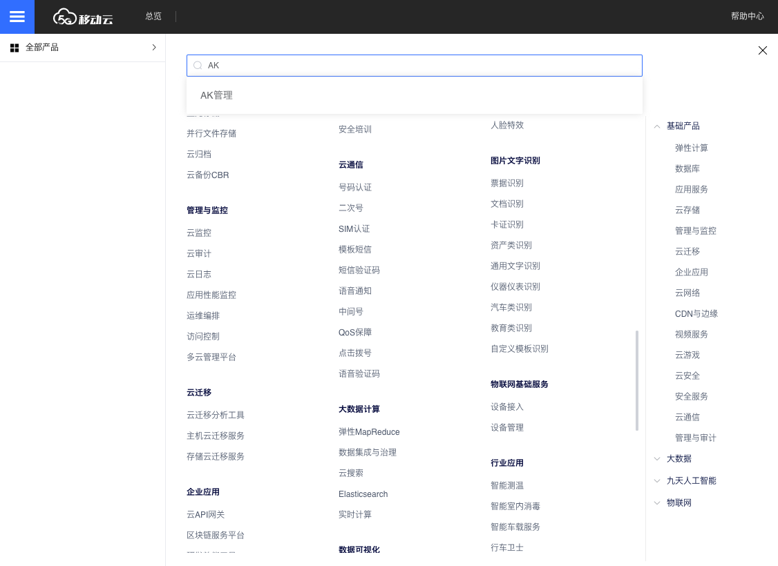 登录移动云控制台,在所有产品中搜索“AK管理”,进入AccessKey管理页面。
