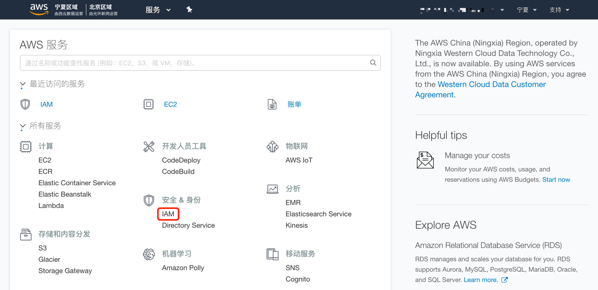 使用AWS主账号(或拥有AdministratorAccess管理权限的子账号)登录AWS管理控制台,单击 “IAM” 菜单项,进入IAM控制面板页面。