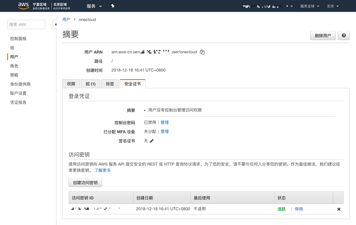 - 获取访问密钥:在AWS组织账号上的管理账号的IAM用户创建访问密钥,建议使用具有AdministratorAccess权限的用户。