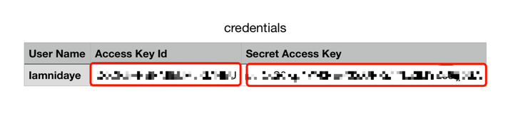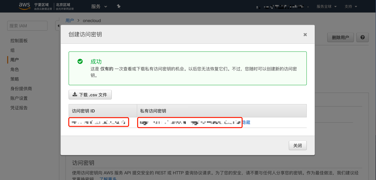 通过验证后,会下载credentials名称的Excel表格,打开表格后即可获取密钥ID(Access Key ID)和密码(Secret Access Key)。