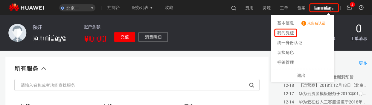 - 登录华为云控制台,鼠标悬停在右上角用户名处,选择下拉菜单 “我的凭证” 菜单项,进入我的凭证页面。