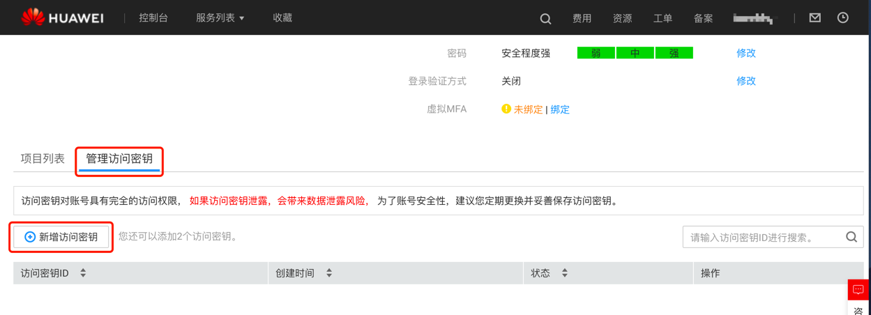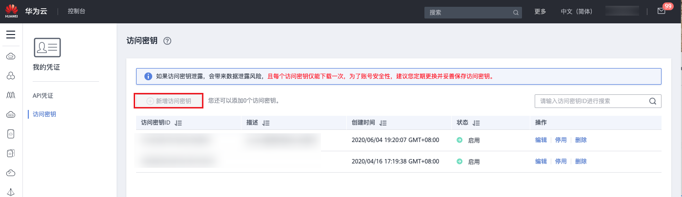 - 单击“管理访问密钥”页签,在管理访问密钥页面单击 “新增访问密钥” 按钮。