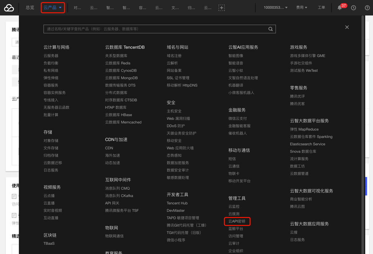 登录腾讯云控制台,单击右上角 “云产品” 菜单项,在展开的菜单中搜索 “云API密钥” 菜单项,单击进入API密钥管理页面。