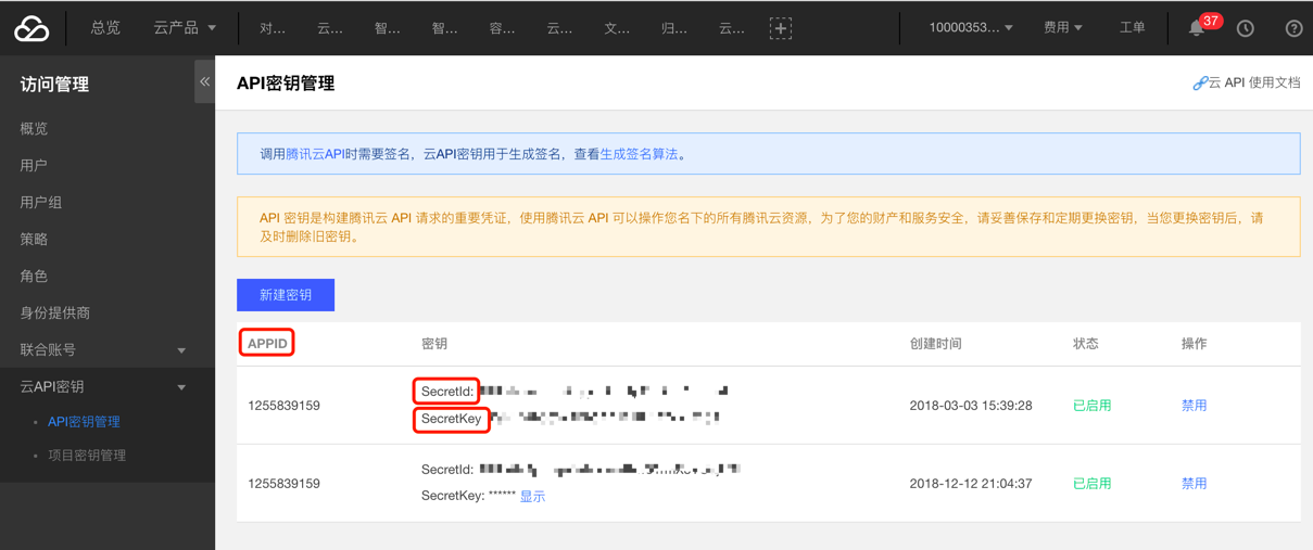 在API密钥管理页面获取APP ID、密钥ID(SecretId)、密码(SecretKey)对应的值。