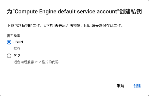 选择密钥类型为“JSON”,单击 “创建” 按钮,下载json格式的密钥文件,内容如下,分别获取project_id、private_key_id、private_key、client_email等内容。