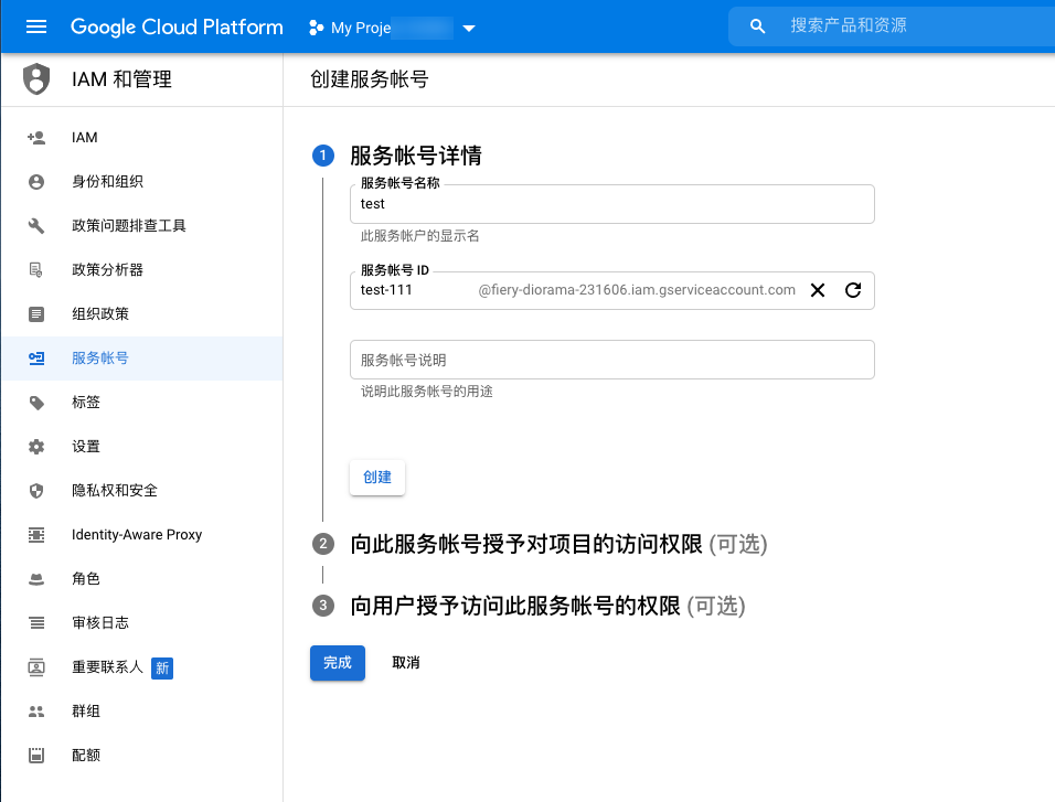 配置服务账号名称、服务账号ID、服务账号说明等,单击 “创建” 按钮,创建服务账号并向此服务帐号授予对项目的访问权限。