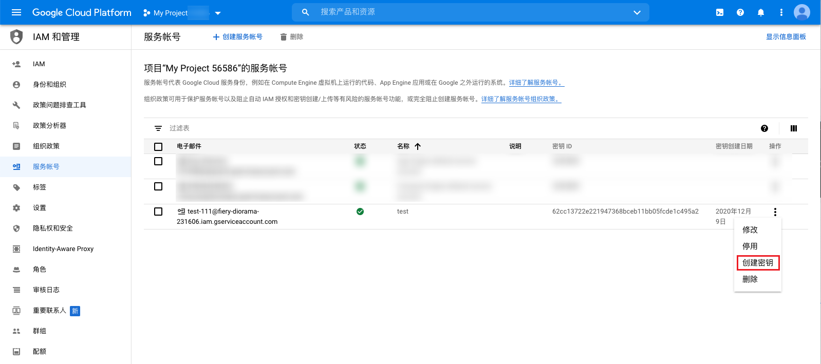 在服务账号页面,单击新创建的服务账号右侧操作列按钮,单击 “创建密钥” 菜单项。
