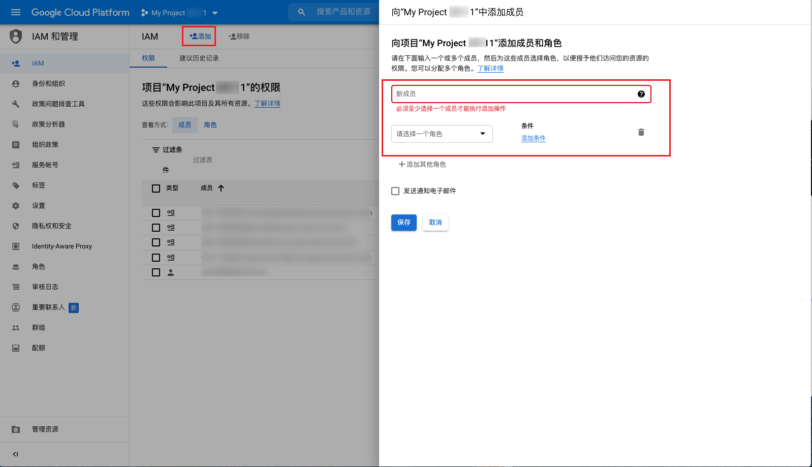 单击顶部 “添加” 按钮,在新成员中添加上面步骤创建的服务账号,并设置角色为Project-Owner或Project-Viewer,Owner代表对项目的管理权限,Viewer代表对项目的只读权限,如需云管平台对Google云账号资源进行管理操作,请选择Project-Owner角色,单击 “保存” 按钮。