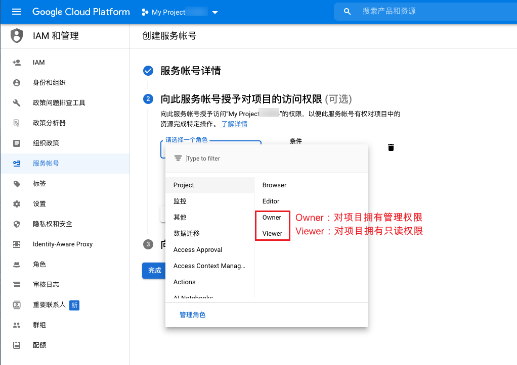选择Project-Owner或Project-Viewer角色,Owner代表对项目的管理权限,Viewer代表对项目的只读权限,如需云管平台对Google云账号资源进行管理操作,请选择Project-Owner角色,单击 “继续” 按钮。