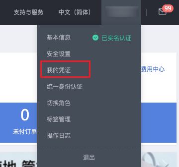 登录华为云控制台,鼠标悬停在右上角用户名处,选择下拉菜单 “我的凭证” 菜单项,进入我的凭证页面。