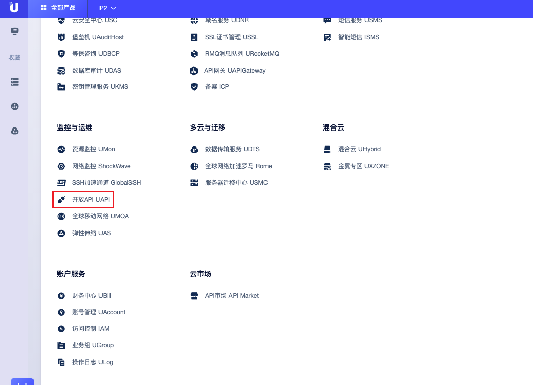 登录 UCloud 控制台,单击顶部 “全部产品” ,搜索或选择 “开放API UAPI” 菜单项 ,进入 API 产品页面;