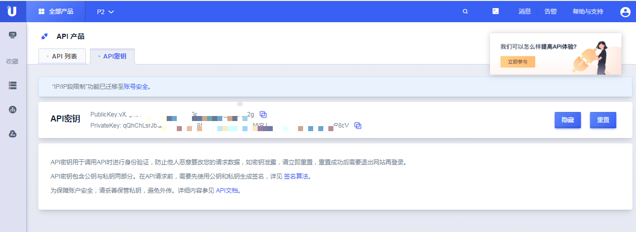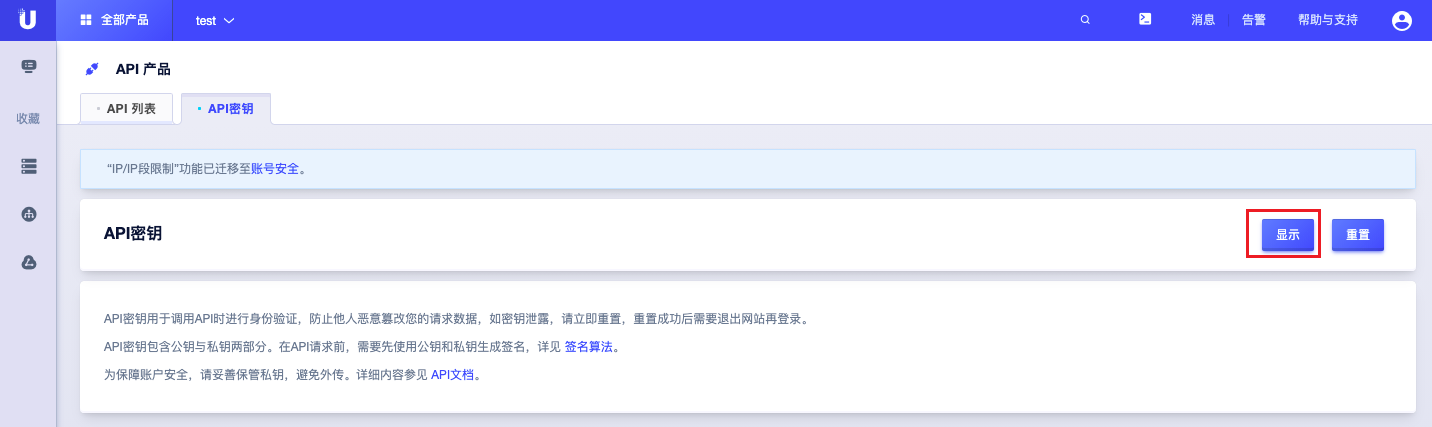 单击“API密钥”页签,进入API 密钥页面。单击 “显示” 按钮,进行手机短信二次验证;
