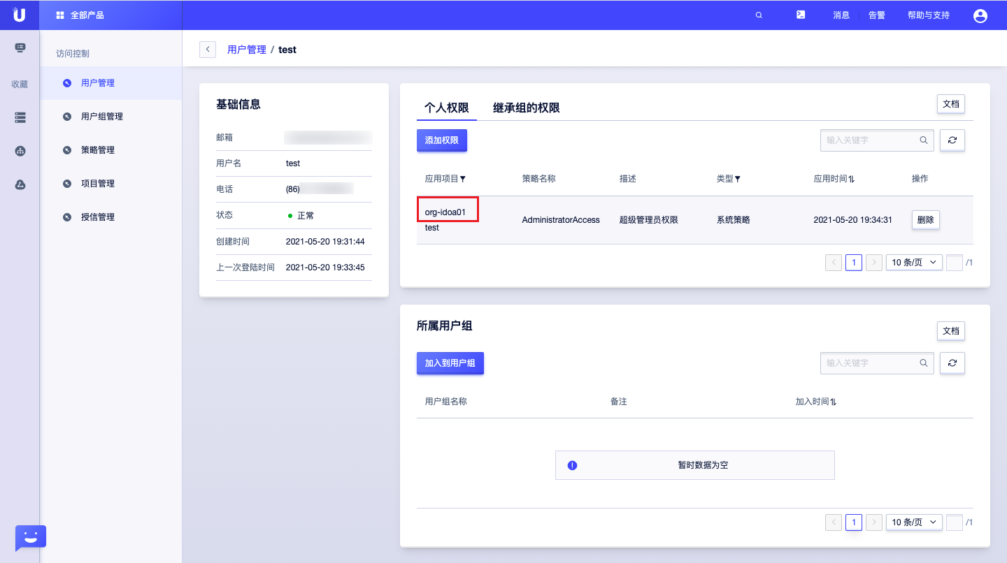 单击左侧菜单栏 “用户” 菜单项,进入用户管理列表,单击用户名名称项,进入指定用户详情页面。注意需要选择有足够管理权限的用户。